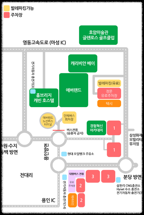 에버랜드는 대중교통과 자가용 모두 쉽게 접근할 수 있습니다. 축제 기간 동안 셔틀버스도 운영되니 이용에 참고하시기 바랍니다.