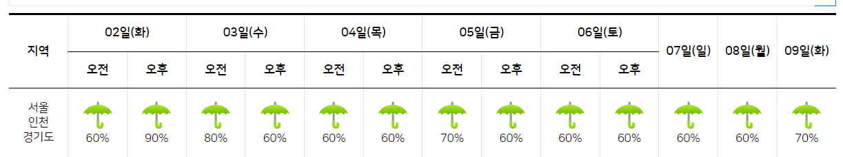 기상청에 따르면, 서울을 포함한 중부지방의 장마 시작일은 이번 주말인 6월 29일부터 30일 사이로 예상됩니다.