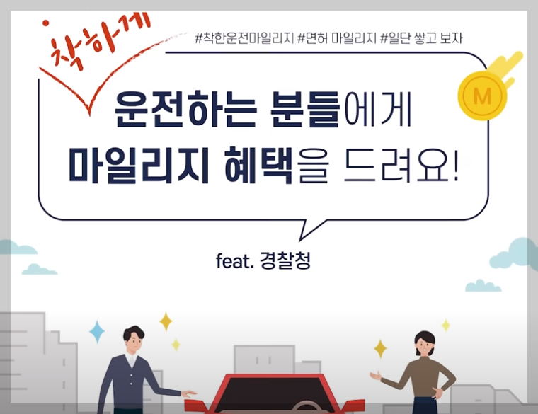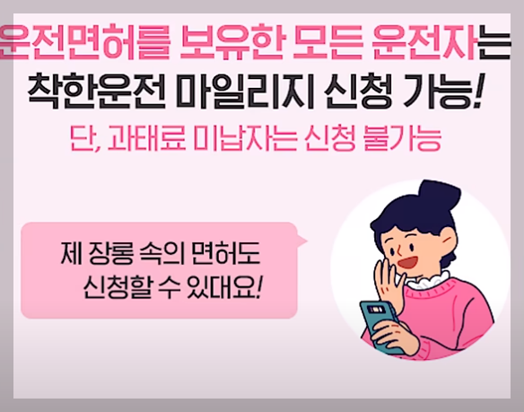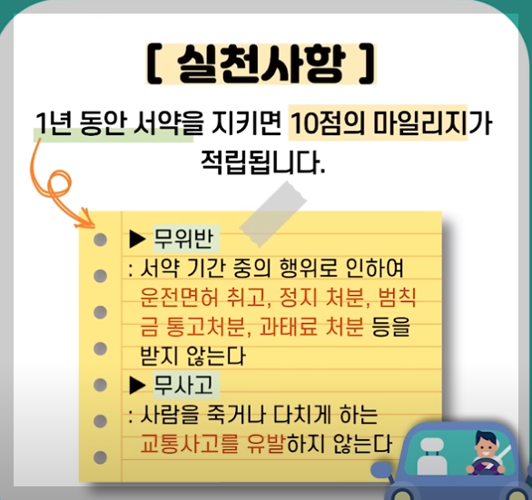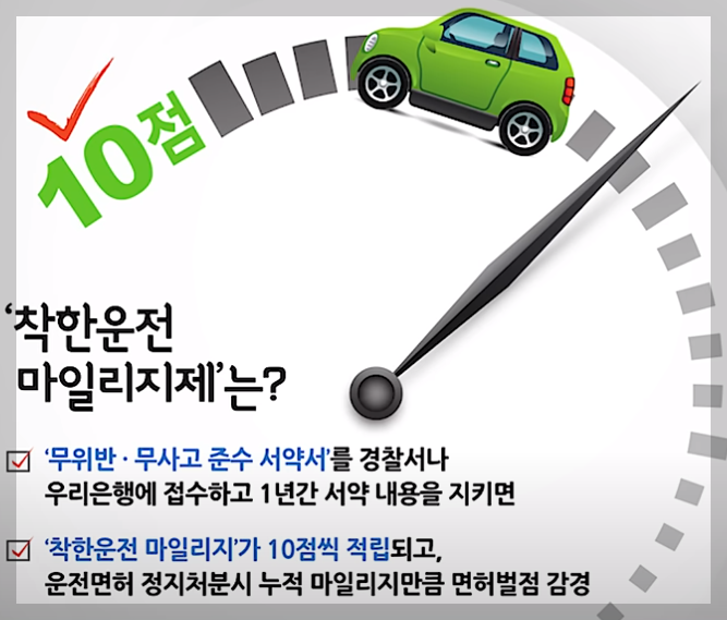 착한 운전 마일리지는 내가 교통법규를 잘 지키겠다고 서약한 다음 1년 동안 잘 유지하면 마일리지를 적립해 주는 제도입니다.