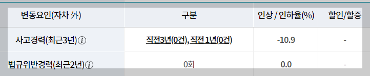법규위반경력(최근 2년)을 확인해 보세요. 만약 그동안 여러분들이 계속 모르고 범칙금을 낸 이력이 있다면 이 부분에 보험료 할증이 붙은 횟수가 표시되니 꼭 확인해 보시기 바랍니다. 다행히 저는 없었던 걸로 나오네요.