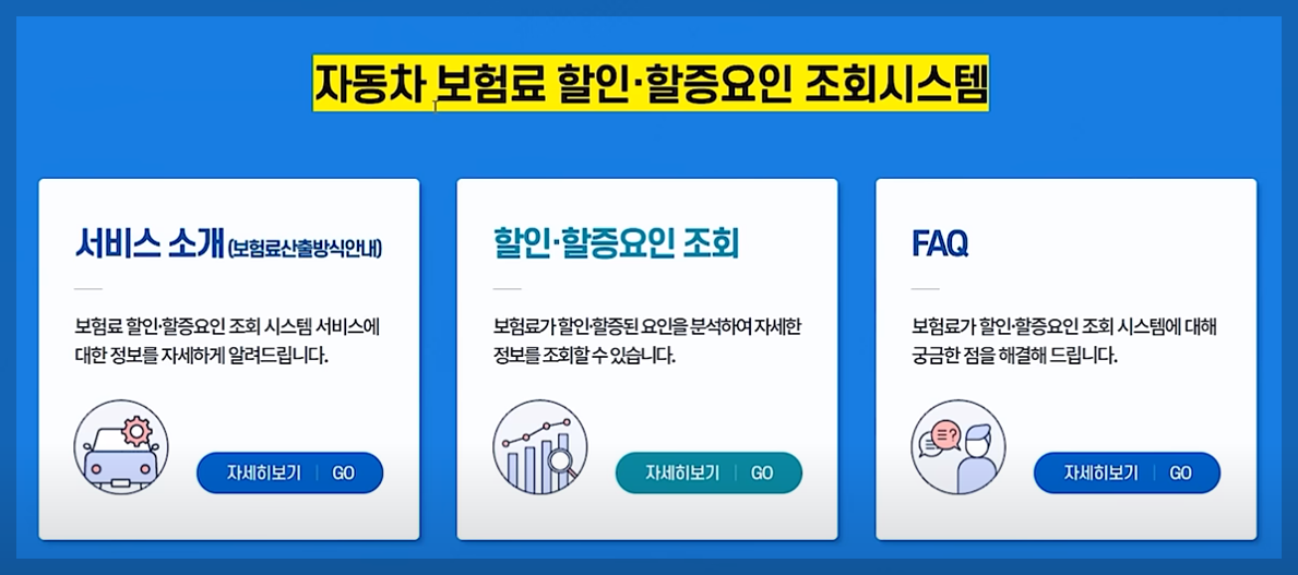 자동차 보험 종합포털 사이트에 들어가셔서 중간에 할인, 할증요인 조회를 누르시면 로그인 창이 나옵니다. 간편 로그인을 하시면 작년과 올해 보험료가 왜 올랐고 왜 내려갔는지 한눈에 볼 수 있습니다.