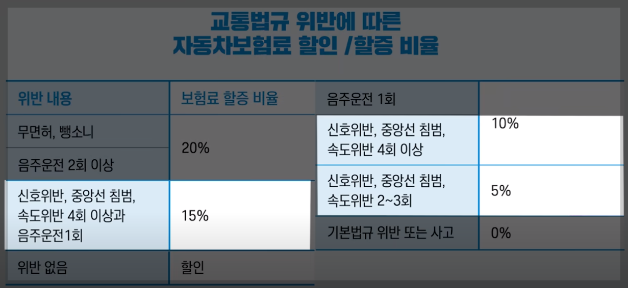 우리가 흔히 실수하는 위반이 신호위반과 속도위반인데, 2~3회 위반하게 되면 5%의 보험료가 할증이 됩니다.