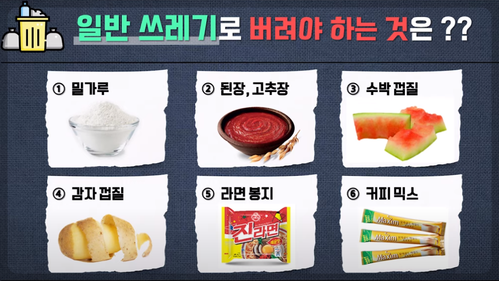 정답은 2번 된장, 고추장입니다. 밀가루가 일반 쓰레기라고 잘못 알고 계신 분들이 많으실 텐데 튀김가루, 부침가루, 밀가루도 모두 음식물 쓰레기입니다. 귀찮다고 가끔 밀가루를 싱크대나 변기에 버리는 분들이 계시는데 절대 안 됩니다. 밀가루는 하수구에 껌보다도 훨씬 독하게 달라붙고, 게다가 마르면 시멘트처럼 굳기 때문에 아무리 귀찮아도 반드시 음식물 쓰레기로 버려야 됩니다. 된장과 고추장의 경우는 음식물 쓰레기라고 생각할 수 있지만, 장류는 염도가 높아서 동물 사료로 만들 수 없기 때문에 물에 희석해 버리거나 통째로 종량제 봉투에 담아서 버리셔야 합니다.