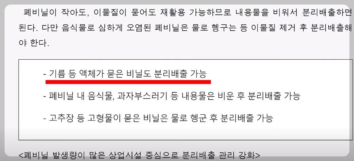 예를 들어 기름 등 액체가 묻은 비닐도 분리배출이 가능합니다. 고추장이나 고형물이 묻은 비닐은 물로 간단히 헹군 다음에 버리면 됩니다.