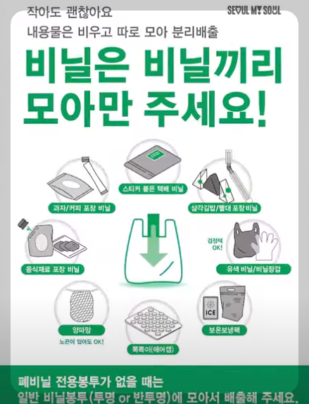 가장 중요한 점은 이 폐비닐 활성화 사업이 서울이 있는 상가나 마트의 경우는 폐비닐 전용 봉투에(무료배포) 담아서 따로 버려야 되지만, 일반 주택가의 경우는 투명 봉투나 반투명 봉투에 담아서 버리면 됩니다. 아파트의 경우는 기존처럼 그냥 버리시면 됩니다.