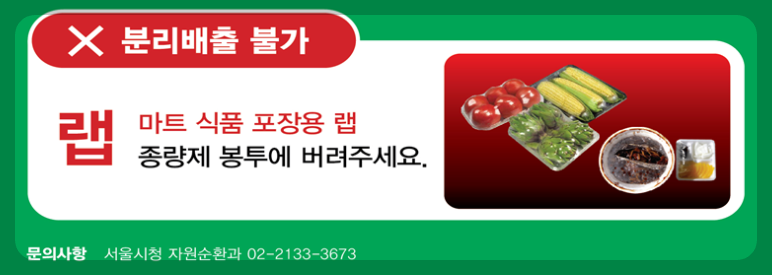 마트에서 식품 포장용으로 씌운 랩은 재활용이 되지 않기 때문에 꼭 일반 쓰레기로 버려야 합니다.