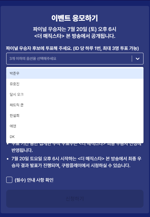투표 페이지에서 파이널에 진출한 마술사들의 목록을 확인할 수 있습니다. 응원하는 마술사의 프로필을 선택하여 신청하기 버튼을 클릭합니다.