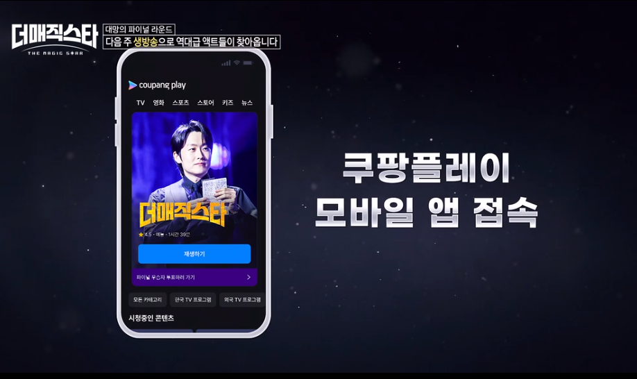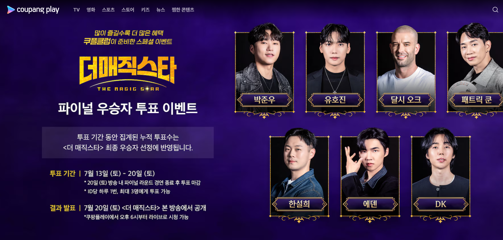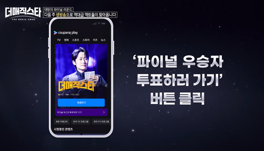 쿠팡플레이 앱 메인 화면에서 '더 매직스타' 배너를 찾거나 검색창에 '더 매직스타'를 입력하여 투표 페이지로 이동합니다.