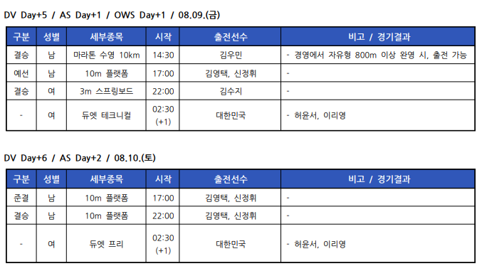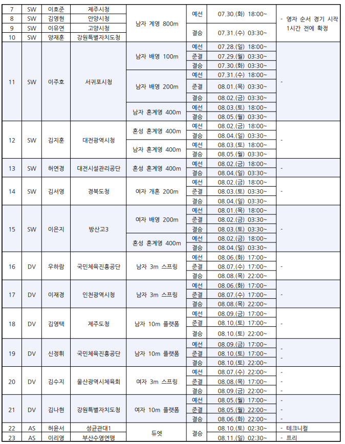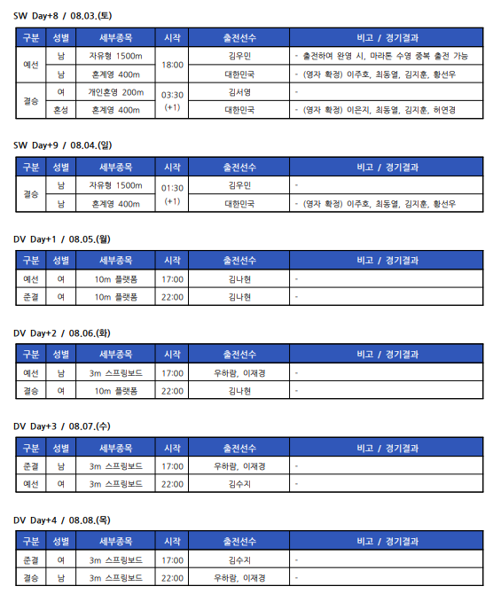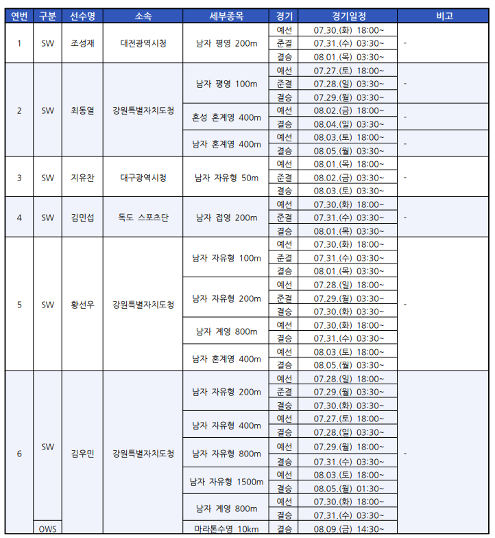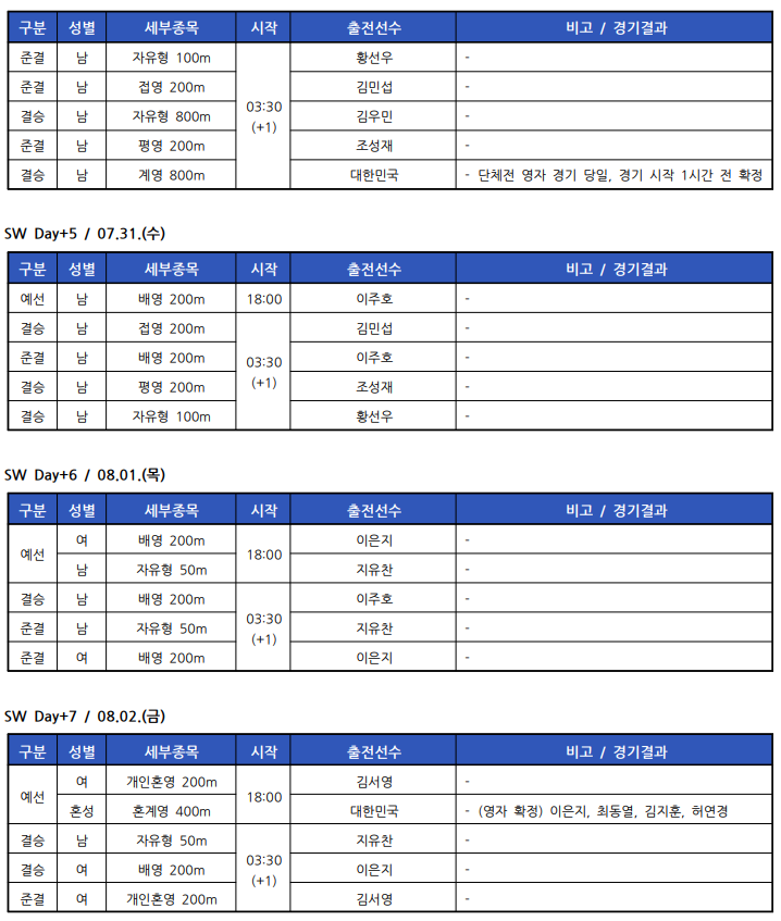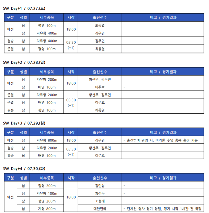 파리올림픽 대한민국 수영 경기 일정 pdf파일(날짜별_현지시간기준)