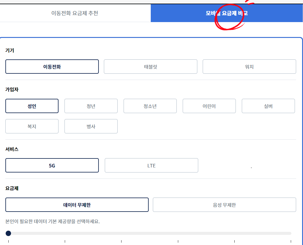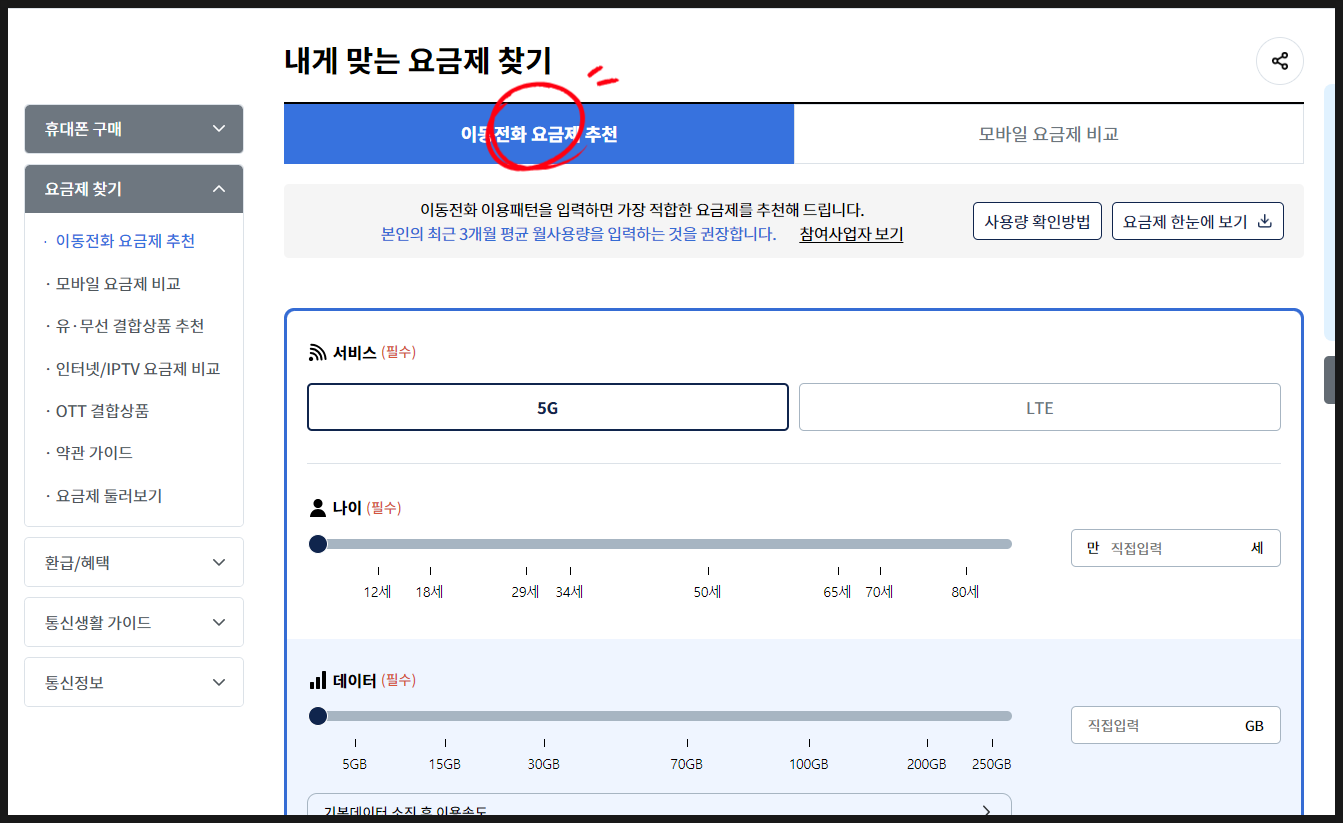 3. 사용패턴에 따라 이동전화 요금제 추천 혹은 모바일 요금제 비교를 눌러줍니다.