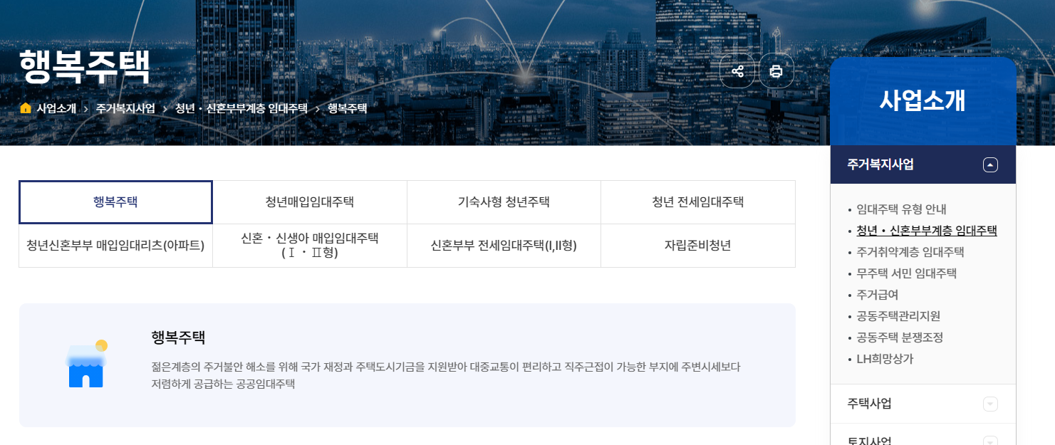 - 3순위 : 본인의 월평균 소득이 전년도 도시근로자 1인 가구 월평균소득 100% 이하, 행복주택(청년) 자산기준 충족