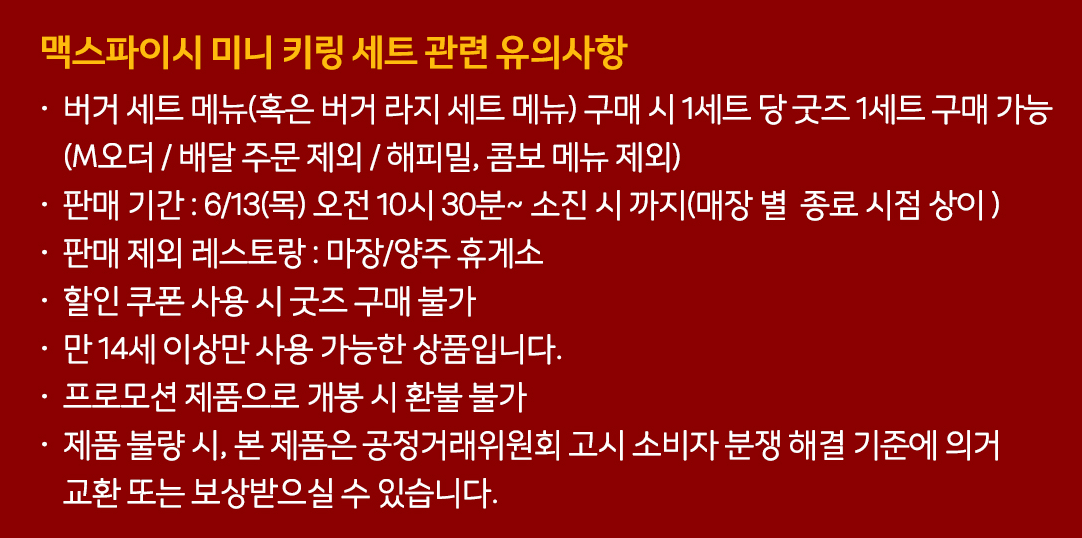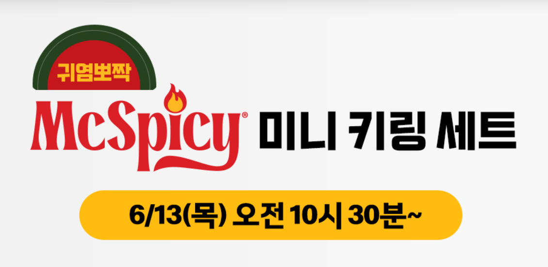 맥도날드의 맥스파이시 미니키링세트는 2024년 6월 13일(목) 오전 10시 30분부터 전국 맥도날드 매장에서 한정 수량으로 판매됩니다. 이 특별한 키링세트는 맥도날드의 매장 내 주문과 드라이브 스루를 통해 구매할 수 있으며, 빠르게 소진될 가능성이 높아 서두르는 것이 좋습니다.