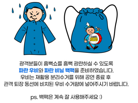 - 우비: 싸이흠뻑쇼에서 준비해 주셨지만, 그래도 젖으니 젖기 싫으신 분들은 여분의 우비를 준비하세요.