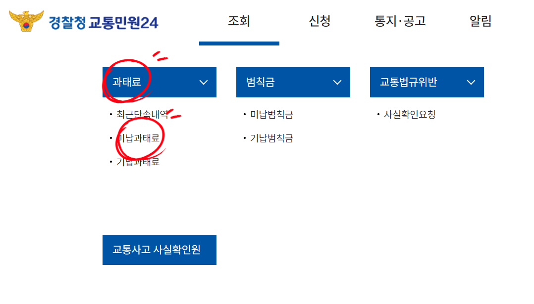 - 조회>과태료>미납과태료 메뉴를 클릭합니다.