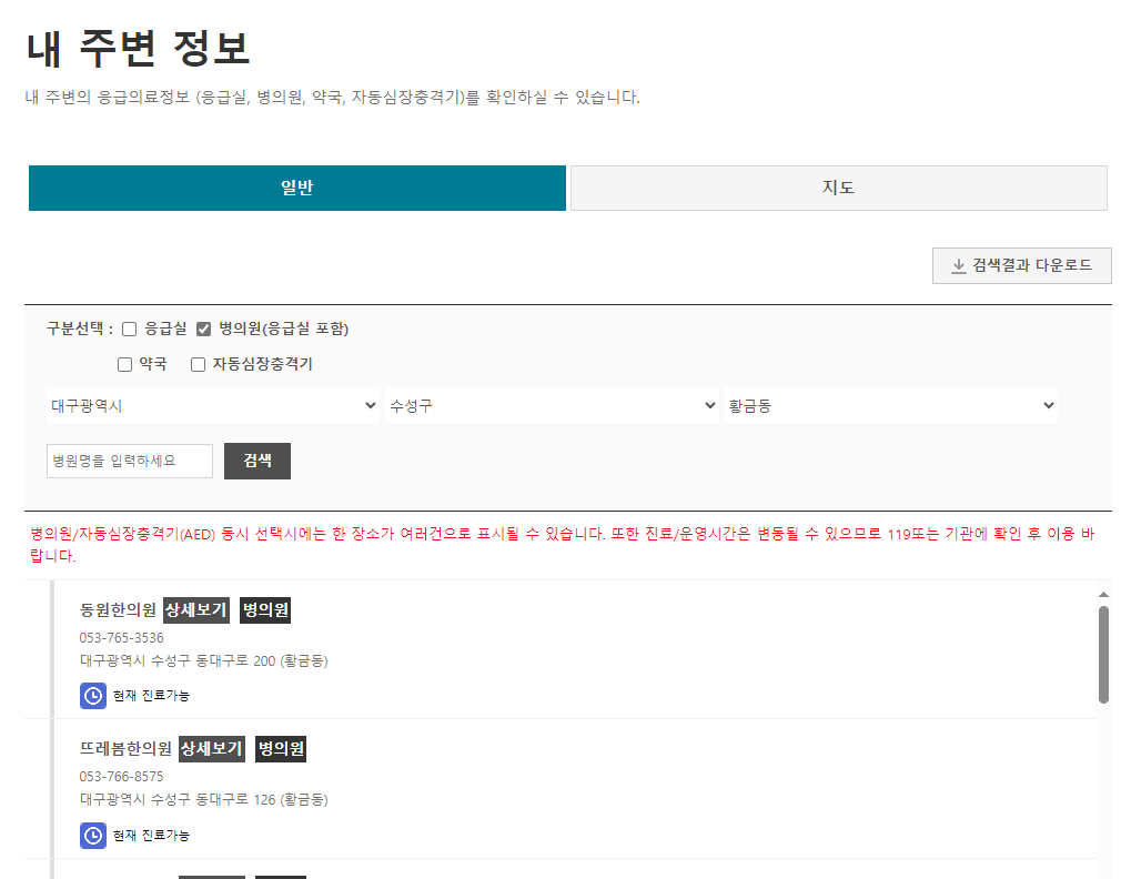 내 주변의 응급의료정보(응급실, 병의원, 약국, 자동심장충격기)를 확인하실 수 있습니다.