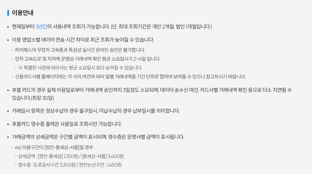 이렇게 하면 하이패스를 이용한 모든 내역을 확인할 수 있습니다. 저도 주로 이 방법을 사용해 한 달간의 사용내역을 정리합니다.