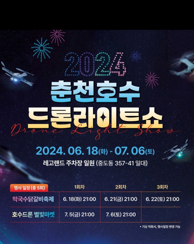 밤하늘에 수놓는 드론라이트쇼는 춘천막구수닭갈비 축제에 오시면 함께 보실 수 있습니다.