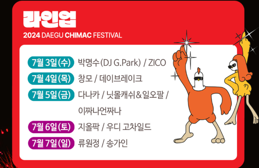 2024 치맥 페스티벌에서는 다양한 프로그램과 이벤트가 준비되어 있습니다. 유명 아티스트들의 라이브 공연, 치킨 먹기 대회, 맥주 시음회, 그리고 가족 단위 방문객을 위한 어린이 놀이 공간까지 모든 연령층이 즐길 수 있는 다양한 콘텐츠가 마련되어 있습니다. 특히, 다양한 맛의 치킨과 세계 각국의 맥주를 맛볼 수 있는 기회는 놓칠 수 없는 즐거움입니다.