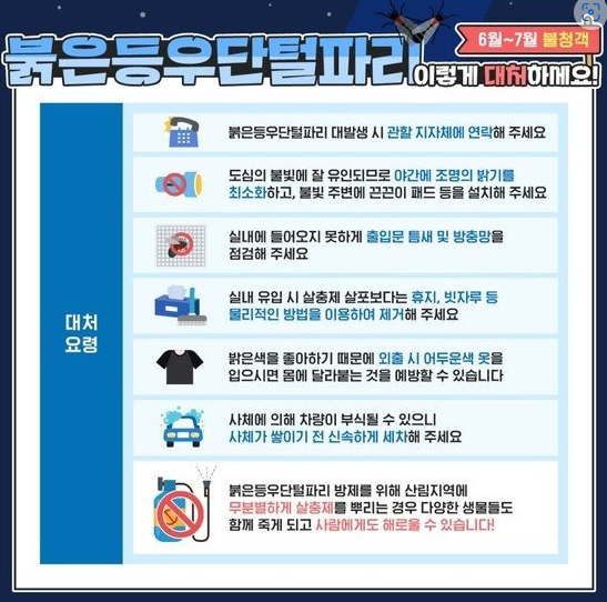 러브버그는 날개가 약해서 물만 뿌려도 쉽게 퇴치가 가능한 것으로 알려져 있습니다. 또 러브버그는 밝은색을 좋아해서 하얀 옷이나 노란 옷에 많이 달라붙는다며 어두운 색 옷을 입는 것도 방법입니다.