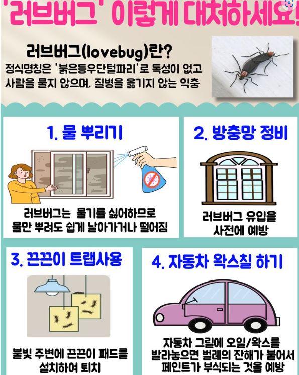 러브버그가 많이 출몰하는 시기에는 집 주변과 차량을 정기적으로 청소하는 것이 중요합니다. 특히, 러브버그가 많이 몰리는 낮 시간대에는 창문을 닫아두는 것이 좋습니다.